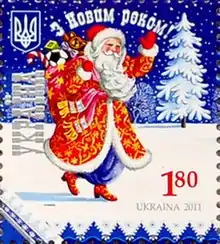 Since the breakup of the Soviet Union, and especially in recent years, there has been a shift from Ded Moroz (Ukrainian: Дід Мороз), who came to be associated with the Soviet-era heritage, to Saint Nicholas (Святий Миколай, Sviatyi Mykolai), who is more popular in Western Ukraine.[52] With the onset of the Russian invasion there were rumors that Ded Moroz imagery was being discouraged by the authorities; however, the Ukrainian Ministry of Culture had denied this.[53]