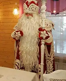 Ded Moroz (Russian: Дед Мороз, romanized: Ded Moroz, [dʲet mɐˈros]; Russian diminutive: Russian: Дедушка Мороз, romanized: Dedushka Moroz; Slovak: Dedo Mráz; Polish: Dziadek Mróz; Belarusian: Дзед Мароз, romanized: Dzied Maroz; Ukrainian: Дід Мороз, romanized: Did Moroz; Serbian: Деда Мраз/Deda Mraz; Bulgarian: Дядо Мраз, romanized: Djado Mraz) or Morozko (Russian: Морозко, romanized: Morozko) is a legendary figure similar to Saint Nicholas, Father Christmas, and Santa Claus who has his roots in Slavic mythology.[1] The tradition of Ded Moroz is mostly spread in East Slavic countries and is a significant part of Russian culture. At the beginning of the Soviet era, communist authorities banned Ded Moroz. However, the ban was lifted and he soon became a significant part of Soviet culture. The literal translation of Ded Moroz is Old Man Frost, but traditionally the name is translated as Father Frost.