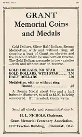 - ↑ "Final sale of Grant Memorial coins (advertisement)". The Numismatist: 524. December 1922.