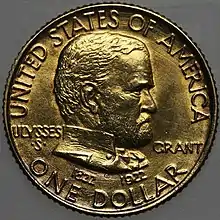 The designs for the two coins are identical except for the denomination. Laura Fraser worked from a photograph of Grant, by the studio of Mathew Brady, for the obverse; Taxay described Fraser's version as "remarkable for its strength and character".[17] On the coin, Grant wears a military coat, as he did during the Civil War, but the closely cropped beard suggests he is meant to look as he did in the years after the conflict.[18] Beneath the bust of Grant, facing right, is Fraser's initial G, for her birth last name, Gardin. Arlie L. Slabaugh, in his volume on commemorative coins, noted that Fraser had signed the Alabama coin LGF, and suggested that the single initial was to make less obvious the designer, lest there be charges of nepotism due to her husband's status as a CFA member.[19] Elsewhere on the obverse may be found Grant's name, the centennial dates, the denomination of the coin, and the issuing nation.[19]