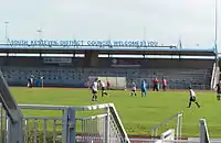 The club spent much of their history playing at London Road until leaving during the 1990–91 season.[2] They briefly groundshared with Spalding United before moving to the council-owned South Kesteven Sports Stadium in October 1991. The ground was built on the Meres playing fields and is also referred to as 'the Meres'.[10] On one side of the pitch is the seated West Stand, which has uncovered terracing on either side.[10] The East Stand on the other side of the pitch is of a covered terrace. There are no stands behind the goals due to the running track.[10] The ground currently has a capacity of 7,500, of which 750 is seated and 1,950 is covered.[1]