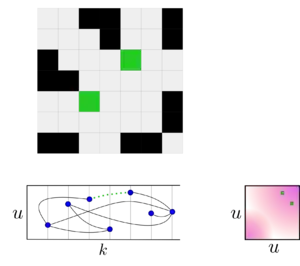 A realization of an exchangeable random graph defined by a graphon. The graphon is shown as a magenta heatmap (lower right). A random graph of size is generated by independently assigning to each vertex a latent random variable (values along vertical axis) and including each edge independently with probability . For example, edge (green, dotted) is present with probability ; the green boxes in the right square represent the values of and . The upper left panel shows the graph realization as an adjacency matrix.