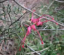 Grevillea asparagoides is a species of flowering plant in the family Proteaceae and is endemic to the south-west of Western Australia. It is dense, prickly shrub with deeply divided leaves, the end lobes linear and sharply pointed, and pink to reddish flowers with red styles.