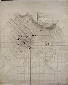 The town plan for Griffith, and nearby Leeton, was designed by Walter Burley Griffin in 1914, an unusual geometric pattern centred on a set of circular streets, with broad avenues radiating out in an octagonal arrangement.[6][7] The streets were surveyed mostly according to that plan, and Griffith was declared a town in August 1916.[8]
