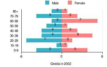 According to the 2002 Poland census, there were 62 people residing in Grobla village, of whom 53.2% were male and 46.8% were female. In the village, the population was spread out, with 19.4% under the age of 18, 37.1% from 18 to 44, 12.9% from 45 to 64, and 30.6% who were 65 years of age or older.[1]
