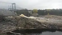The river continues north under Ontario Highway 101, passes over the Upper Falls and series of unnamed cataracts and enters Cochrane District at geographic Enid Township.[6] It continues north through the Flying Post 73 Indian Reserve,[6][7][8] part of the Flying Post First Nation, over unnamed cataracts, jogs west then again north over the course of the Six Mile Rapids and takes in the left tributary Ivanhoe River and right tributary Nat River. The Groundhog River again jogs west, takes in the left tributary Otapingshewee River, then heads north through the Ten Mile Rapids, passes over the Carmichael Falls Generating Station and dam[5][9] and takes in the left tributary Wakusimi River. It heads around Bremner Island, and reaches the community of Fauquier in the incorporated township of Fauquier-Strickland. It is crossed there by Ontario Highway 11 and by the Ontario Northland Railway secondary main line, formerly a Canadian National Railway secondary line and originally the National Transcontinental Railway transcontinental main line.
