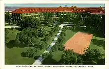 The G&SIRR Company controlled a 6-mile (9.7-km) long channel in the Gulf of Mexico that connected the mainland to Ship Island. Dredging of a shipping channel was completed by the S.S. Bullis Company in 1902; it connected Ship Island and the main railroad terminal at Gulfport.[3] The G&SIRR greatly facilitated the development of the shipping port. Between 1903 and 1907, more than a billion board feet of timber was shipped out of Gulfport. In 1908, the first shipment of cotton was exported by steamship. During the early years after port development, some of the items imported through Gulfport included phosphates, iron pyrite, creosote oil, naval stores and mahogany. From 1910 through 1913, the Port of Gulfport shipped and exported more timber than any other port in the world.[6]