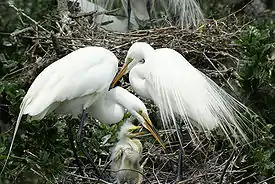 The most popular plumes came from various species of wading birds, known as "little snowies" for their snowy-white feathers; even more prized were the "nuptial plumes", grown during mating season and displayed by birds during courtship.[10] Poachers often stole into the densely populated rookeries, where they would shoot and then pluck the roosting birds clean, leaving their carcasses to rot. Unprotected eggs became easy prey for predators, as were newly hatched birds, who also starved or died from exposure. One ex-poacher would later write of the practice, "The heads and necks of the young birds were hanging out of the nests by the hundreds. I am done with bird hunting forever!"[11]