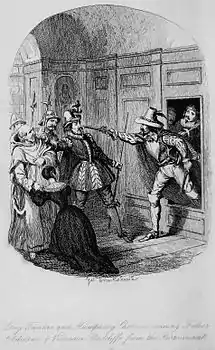 S. M. Ellis, in 1911, said that Guy Fawkes "had been a great financial success, and, it is said, Ainsworth received as much as £1,500 from it. The real reason for this success is not far to seek, for the work is one of the best of historical novels. It arrests attention by its continuity of interest. Incident follows incident, exciting escape upon terrible adventure; on and on – without pause or longueur – the dramatic narrative proceeds, until the inevitable tragic end is reached."[15] In 1972, George Worth argued: "All is well during the first two of the three parts of Guy Fawkes ... But in the third section ... Ainsworth rather badly lets his audience down."[16] Writing in 2003, Stephen Carver claimed that "Although critics are often scathing of this author, Guy Fawkes Book the Second is a reasonable history lesson".[17] Ainsworth's novel transformed Fawkes into an "acceptable fictional character", and Fawkes subsequently began to appear in children's books and penny dreadfuls.[18]