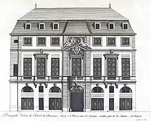 The building contains several unexpected elements for an hôtel particulier. Public shops are located along the ground level, which may be a continuation of an ancient Roman tradition. The mezzanine windows, which were uncommon in Paris, may have been a throwback to High Renaissance in Rome.[6] In the plan, there are different paths for circulation for servants and noblemen. Many unusual details of the plan: the corps de logis placed along the street with the cour d’honneur behind, the circular vestibule, the angled passage from the court to the rue de Jouy, the semicircular ending of the court, and the stair at the left rear of the court, were the result of Le Pautre's use of the foundations of the three medieval houses that originally occupied the lot.[7]