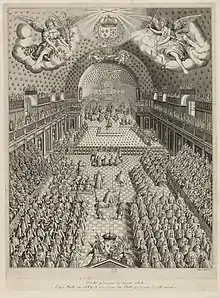The Ballet Comique de la Reine, regarded by James R. Anthony as the first true ballet de cour, was performed at the Petit-Bourbon on 15 October 1581, during the festivities surrounding the marriage of the Duke de Joyeuse and the queen's sister, Marguerite de Vaudemont.[8] The French court's first great carousel (a type of tourney performed as a ballet) was held in the Grande Salle in February 1605.[9] The Estates General of 1614 and 1615 and some of the celebrations accompanying the marriage of Louis XIII in 1615 were also held there.[3]