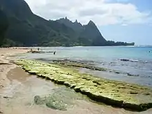 Hāʻena State Park is a state park on the north shore of the Hawaiian island of Kauaʻi. It is often called the "end of the road" and marks the endpoint of the Kuhio Highway.[2] The park provides access to beaches, trails, and several ancient Hawaiian sites, including sea caves estimated to be more than 4,000 years old. Archaeological sites associated with the hula, including a heiau (shrine) dedicated to Laka, are above the park's beaches.[3]