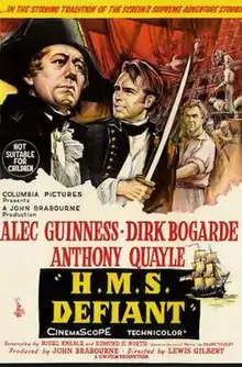 H.M.S. Defiant (released as Damn the Defiant! in the United States[2]) is a British naval war CinemaScope and Technicolor film from 1962 starring Alec Guinness and Dirk Bogarde. It tells the story of a mutiny aboard the fictitious title ship at around the time of the Spithead mutiny in 1797. It was directed by Lewis Gilbert with a screenplay by Nigel Kneale from Frank Tilsley's novel Mutiny (1958).[3] The film's world premiere occurred at the Odeon Leicester Square in London's West End on 22 February 1962.[4]