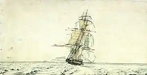 ![]() HMS Doris rounding to under all sail to pick up a man in 1828 | |