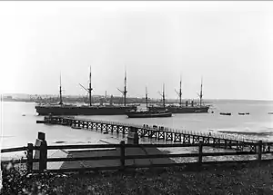 Ganges was occasionally sailed to Devonport to undergo refits. The establishment had become an important part of local life, as in 1870 a rumour began to circulate that Ganges would not return after one such refit. The mayor was pressured to contact the local Member of Parliament, and also to ask questions of a Government minister. The rumour was then disproved.[2] By 1899 the declining number of boys joining Ganges led the Admiralty to decide to move her to a more populated area. Petitions were organised by the local councils, but were unable to sway the Admiralty. Ganges sailed from Mylor on 27 August 1899. She was refitted in Devonport, which involved her keel being scraped. The boys were quartered at HMS Lion and HMS Impregnable whilst this work was carried out.[2] She then sailed to Sheerness in company with HMS Arrogant. She spent two months here before being towed to Harwich by the tug Alligator. She arrived on 11 November 1899. HMS Caroline had arrived shortly before Ganges and served as a temporary hospital ship.[1]
