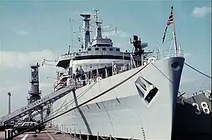 Intrepid was refitted at Devonport Royal Dockyard between January 1984 and June 1985,[2] with two Sea Cat launchers removed, with twin 30 mm anti-aircraft mounts and two single 20 mm cannon added.[3] From June 1985 until 1990 she supported the sea training phase of initial officer training, undertaken at Britannia Royal Naval College, as part of the Dartmouth Training Squadron. During the same period Intrepid also provided Marine Engineering Artificer Apprentices from HMS Sultan their sea training opportunity. During a three to four-month period, each entry of Artificers would spend a week working in each department aboard in order to learn more about the other trades in the Royal Navy.