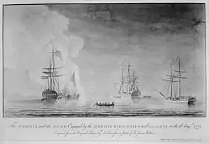 She, along with HMS Rose and three smaller ships, launched an attack on New York City on 12 July 1776.[1] During that attack, Phoenix and the other ships easily passed rebel defences and bombarded urban New York for two hours.[5] This action largely confirmed Continental fears that the Royal Navy could act with relative impunity when attacking deep-water ports.[5] Phoenix continued to harass patriot positions along the Hudson River till 16 August when she withdrew back to the waters off of Staten Island.[6][4] Maps from that autumn show Phoenix and Rose again in the waters south of Manhattan.[7] On 7 January, 1778 she captured French brig Gineveve off Cape Henry.[8] On 10 January, 1778 she captured and destroyed merchant brig Polly off Cape Henry.[9] On 17 January, 1778 she captured merchant sloop Sally off Cape Henry.[10] She captured 2 prizes off Cape Henry in February, 1777. One was the schooner Betsy on 3 February.[11][12] On 19 February, 1778 she captured sloop Sally 280 Leagues off Martha's Vineyard.[13]