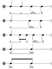 The dhikr ceremonies may have a ritually determined length or may last as long as the Sheikh deems his murids require. The haḍra section consists of the ostinato-like repetition of the name of God over which the soloist performs a richly ornamented song. In many haḍras, this repetition proceeds from the chest and has the effect of a percussion instrument, with the participants bending forward while exhaling and stand straight while inhaling so that both the movement and sound contribute to the overall rhythm. The climax is usually reached through cries of "Allah! Allah!" or "hu hu" (which is either the pronoun "he" or the last vowel on the word "Allah" depending on the method) while the participants are moving up and down. Universally, the haḍra is almost always followed by Quranic recital in the tarteel style - which according to al-Junayd al-Baghdadi, was a prophetic instruction received through a dream.