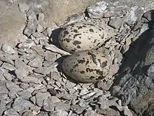 A clutch of two to three eggs is laid in a crevice in rocks or small hollow or flat on the ground, often on an island or high place where parent birds can keep watch. Tapered oval in shape, the eggs are buff to beige with dark brown and lavender dots and splotches and measure 63 mm (2.5 in) long by 42 mm (1.7 in) wide.[10]