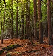 The first settlers in the area found a very dense forest that was according to Conrad Weiser, "so thick that for a mile at a time we could not find the place the size of a hand, where the sun could penetrate, even in the clearest day..." Some examples of this dense forest still stand today at R. B. Winter State Park. The Rapid Run Natural Area is 39 acres (16 ha) of land set aside "to provide a location for scientific observation of natural systems, to protect an example of a typical and unique plant and animal community, and to protect and outstanding example of natural interest and beauty." This natural area has been largely untouched since it was last logged for timber in 1850. Pileated woodpeckers can be seen in this area. Barred owls also live in the Rapid Run Natural Area. Vernal pools fill each spring to provide water for fairy shrimp, caddis-flies, spotted salamanders, and wood frogs.[4]