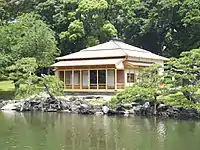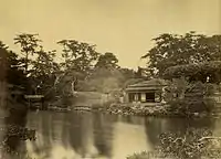 After the Meiji restoration, the site was proclaimed the "Hama Palace" (浜離宮, Hama-rikyū) by Emperor Meiji, and continued to be used as a state guest house until the construction of the Rokumeikan. In 1879, Emperor Meiji received Crown Prince Frederick William of Germany at the Hama-rikyū. Later that year, former United States President Ulysses Grant stayed for a month at the Hama-rikyū during his extended visit to Japan.[2] The state guest house was demolished in 1889. The gardens burned during the 1923 Great Kanto earthquake and again in March 1945 during the Tokyo air raid. In November 1945, the Hama-rikyū was transferred from the Imperial Household Agency to Tokyo Metropolis and was opened as a public garden in April 1946. In 1952, it was designated as a Special National Historic Site and also as a Special National Place of Scenic Beauty.[3] Various teahouses have been reconstructed in the 2010s.