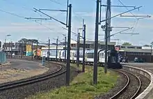 Frankton Junction station consisted of an island platform located on the NIMT just north of the junction between the ECMT and NIMT. It had two signal boxes, and a locomotive depot was located in the Vee of the junction.[4] In 1909 a new, larger station was built to cope with the extra traffic of the through line to Wellington, 16 chains (1,100 ft; 320 m)[5] to the north.[6] The first Auckland - Wellington through expresses ran on 14 February 1909, taking 19 hours 13 minutes, and stopping at Frankton.[7]