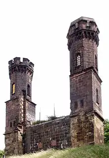 The original Hamm Railway Bridge was a double-track bridge built by the Bergisch-Märkische Railway Company from April 1868 as the first solid bridge across the Rhine in Düsseldorf and was opened on 24 July 1870. It was named the König-Wilhelm-Brücke ("King William Bridge") or König-Wilhelm-Eisenbahn-Rheinbrücke (“King William railway bridge across the Rhine”) after the Prussian King William I. It was built as a wrought iron arch supporting a three-span truss to plans of the engineer Pichier of the Harkort Company (Harkort’sche Fabrik) of Duisburg. The bridge towers on both sides reflected not only a need for architectural decoration, but also a desire to promote the military security of the bridge in the event of a war. For the same reason there was an outer fort at the side of the bridge, which was removed in 1885.[1] Between July and September 1896, the approaches to the bridge were repaired and the track body was renewed under traffic. The whole construction was carried out in heavy traffic with all traffic handled on a single track.[1]