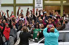 The phrase became a rallying cry for protesters and others trying to draw attention to the killing of Brown and other African Americans by police officers. In November 2014, some members of the St. Louis Rams ran out on the field during pregame introductions with their hands raised above their heads, an action repeated by four members of the Congressional Black Caucus on the House floor in December 2014.[26] The hybrid slogan "Hands Up, Don't Shoot" quickly spread beyond the Ferguson protests. It was often said in solidarity with the protesters in Ferguson.[27][28][29][30]