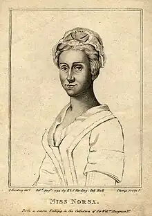 By 1736 she had come under the wing of Robert Walpole, the son and heir of the former Prime Minister Robert Walpole and brother of the writer Horace Walpole. Horace described Norsa as "my brother's concubine."[2] Robert's marriage had broken up in a formal separation, and Norsa went to live with him, moving (when he succeeded to the peerage as Earl of Orford in 1745) to Houghton Hall in Norfolk. A local clergyman's wife wrote of her in 1749 "She is a very agreeable Woman, & Nobody ever behav'd better in her Station, She have every body's good word, and bear great Sway at Houghton, She is every thing but Lady, She came here in a Landau & Six horses & ... a young Clergyman with her."[1] Norsa had a son with Orford, born in 1740, who apparently died young.[3] The music historian David Conway considers Norsa's story "an archetypal tale of how stage stardom might lead to social transformation."[2]