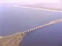 Near Numansdorp, the Hollands Diep splits into the Haringvliet and the Volkerak estuaries. It is closed off near Goedereede from the North Sea by the Haringvlietdam, which provides a road connection between the island of Voorne to the north and the island of Goeree-Overflakkee to the south.[3] The dam with its sluices was built as part of the Delta Works sea barrier protection works.[4]