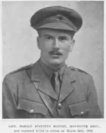 During World War I, Hodges served with the 3rd Battalion Monmouthshire Regiment. On the night of 22 March 1918, he entered a small factory on a road between Ham and Eppeville, hoping to make contact with a British battalion. He instead encountered enemy troops and was shot dead.[4]