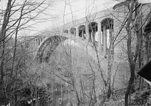 Its three spans included an open-spandrel ribbed arch over Roaring Brook, flanked by two closed-spandrel arches. The southwestern closed-spandrel arch spanned the former Lackawanna and Wyoming Valley Railroad (Laurel Line), converted to highway use in 1964 as the Central Scranton Expressway.[2] The northeastern closed-spandrel arch spans the former Delaware, Lackawanna and Western Railroad, now a heritage railroad operated by Steamtown National Historic Site.