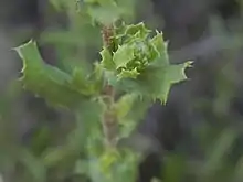 The branches of this species are 3–30 mm (0.12–1.18 in) in diameter and reach 5–10 dm (20–39 in) in length, and are covered with sparse, villous hairs (trichomes). The branches are leafy throughout, with the internodes measuring around 1–2.5 cm (0.39–0.98 in), usually with small fascicles in the axils. The leaves are sessile, and are shaped ovate-oblong to oblong, 1.5–5 cm (0.59–1.97 in) long and 3–18 mm (0.12–0.71 in) wide. Most of the leaf is usually free of hair. On the lower surface of the leaf is a prominent midrib, towards the base of which the only hairs on the leaf may be found. The margins of the leaf are distinctly dentate, with acute and spiny serrations throughout.[7][8]