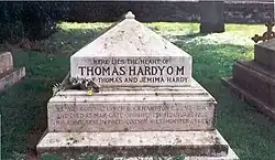- Thomas Hardy (d. 1928), novelist and poet. His ashes were interred in Poets' Corner of Westminster Abbey, while his heart was buried in his beloved Wessex alongside his first wife. A recent biography of Hardy details the arguments over the decision, and addresses the long-standing rumour that the heart was stolen by a pet cat so that a pig's heart had to be used as a replacement.[9]