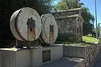 The Heber C. Kimball Gristmill monument is located in Bountiful just south of Bountiful High School. It consists of a 1:3 scale replica burr mill built in 1937 and two original burr-type grist stones found in 1984 during city excavation for a debris catch at the end of Mill Creek. Also erected are three four-foot-high pillars dedicated to three men involved in the building and operation of the mill: Heber Chase Kimball, Daniel Davis and George Quinn McNeil.[1]