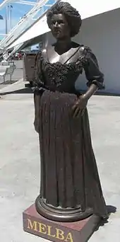 In 1922, Melba returned to Australia, where she sang at the immensely successful "Concerts for the People" in Melbourne and Sydney, with low ticket prices, attracting 70,000 people.[1] In 1924 for another Williamson opera season, she caused resentment among local singers by importing an entire chorus from Naples.[55] In 1926 she made her farewell appearance at Covent Garden, singing in scenes from Roméo et Juliette, Otello, and La bohème.[3] She is well remembered in Australia for her seemingly endless series of "farewell" appearances, including stage performances in the mid-1920s and concerts in Sydney on 7 August 1928, Melbourne on 27 September 1928 and Geelong in November 1928.[1] From this, she is remembered in the vernacular Australian expression "more farewells than Dame Nellie Melba".[1]
