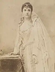 Melba's father moved the family to Mackay, Queensland, where he built a new sugar mill. Melba soon became popular in Mackay society for her singing and piano-playing.[6] On 22 December 1882 in Brisbane, she married Charles Nesbitt Frederick Armstrong (1858–1948), the youngest son of Sir Andrew Armstrong.[7] They had one child, a son, George, born on 16 October 1883.[8] The marriage was not a success; Charles reportedly beat his wife more than once.[4] The couple separated after just over a year,[3] and Melba returned to Melbourne determined to pursue a singing career, debuting professionally in concerts in 1884.[4] She was often accompanied in concert, and some of her concerts were organised, at times throughout her career by the flautist John Lemmone, who became a "lifelong friend and counsellor".[9] On the strength of local success, she travelled to London in search of an opportunity.[n 3] Her debut at the Princes' Hall in 1886 made little impression, and she sought work unsuccessfully from Sir Arthur Sullivan, Carl Rosa and Augustus Harris.[2][10] She then went to Paris to study with the leading teacher Mathilde Marchesi, who instantly recognised the young singer's potential: she exclaimed, "J'ai enfin une étoile!" ("I have a star at last!"). Melba made such rapid progress that she was allowed to sing the "Mad Scene" from Ambroise Thomas's Hamlet at a matinée musicale in Marchesi's house in December the same year, in the presence of the composer.[2]