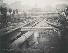 When the IRT subway debuted in 1904,[1][2] the typical tunnel construction method was cut-and-cover.[3][4] The street was torn up to dig the tunnel below before being rebuilt from above.[3][4] Traffic on the street above would be interrupted due to the digging up of the street.[5] Temporary steel and wooden bridges carried surface traffic above the construction.[6] The 7,700 workers who built the original subway lines were mostly immigrants living in Manhattan.[7][8]