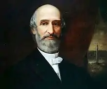 Henry Chandler Bowen, oil portrait, 41 1/2 x 36 3/8, 1876, Historic New England. Probably made by James J. Sawyer. Roseland Cottage is in the background of the portrait.