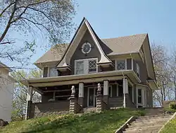 The Henry Ockershausen House is a 2½-story, frame structure with a steep side-gable roof and a large front gable. It exemplifies the transition from the Queen Anne style, which was popular in the late 19th-century, to the Colonial Revival style that became popular in the early 20th-century.[2] Its verticality in form, especially the large wall dormer in the center of the main facade, is from the Queen Anne style. The dormer's soffits curve inward and meet the partially returned cornices. Its verticality is enhanced from its location on the crest of a hill, which naturally draws the observer's eye upward. Various decorative elements suggest the Colonial Revival style. A large Adamesque oval window is located in the center of the wall dormer on the front, and there is a tall glass oval window at the main entrance. The full-length porch on the front of the house is built on a rock-faced stone foundation. It is noteworthy for the two lion statues on pedestals at the base of the steps.