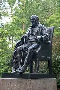 Lord Holland's statue rises from a pond in Holland Park, London.