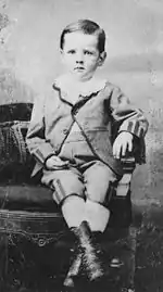 On August 10, 1874, Herbert (known in his childhood as "Bert" or "Bertie") was born as the second child to Jesse and Hulda. Jesse's blacksmith had grown to be very successful, and in 1878, Jesse Hoover sold the practice to open a farm implement store on the corner of Main and Downey Streets.[4] In March 1879, the family moved to the House of the Maples, a two-story frame house. Hoover may have attended classes at an 1853 schoolhouse at the corner of Main and Downey Streets.[5] He attended Quaker services at the nearby Friends Meetinghouse.[6]