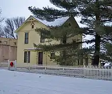 Laban Miles was the brother-in-law of Hulda Hoover. The Miles and Hoover families became close friends, and Herbert would play with the Miles children. Laban Miles later served Rutherford B. Hayes as an Indian agent. Hoover briefly lived with the Miles family in 1882 on the Osage Nation reservation while permanent plans were being made for his rearing.[18] A farmstead owned by the Miles family south of the residential district is also part of the park.[19] Also on Downey Street is the Amanda Garvin House, a fine example of Gothic Revival architecture.[20] The Charles E. Smith House was moved to the site in 1969. Smith built his house in 1903, after Hoover had already left West Branch. However, the National Park Service decided to move the house to the site because of its Queen Anne architecture. His sister was the wife of Dr. L. J. Leech, who also lived on the street. Leech lived in Miles' house after moving to West Branch in 1884. While the Miles family foreclosed on their house, Leech purchased it and lived there. He built his own house next door in 1920.[21]