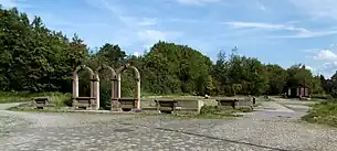 After the closure of the station in 1966 the platforms were quickly torn up, but the main station building remained, standing empty for many years. Eventually, despite local protests, the main station building itself was torn down in 1983. All that now (2014) remains visible is a couple of foundation stones and steps.[3] During the summer of 2014 the local municipality organised an exhibition on the site, dedicated to the station's history.[4] Plans exist for a more permanent display or exhibition centre.[5]