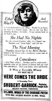 Here Comes the Bride is a lost[1] 1919 American silent comedy film produced by Famous Players–Lasky and released by Paramount Pictures. This film is based on the 1917 Broadway play Here Comes the Bride by Max Marcin and Roy Atwell. The film was directed by John S. Robertson and stars John Barrymore.[2][3][4][5][6][7]