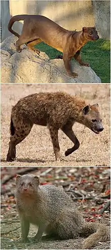 Top to bottom: Fossa, spotted hyena, Indian grey mongoose | |