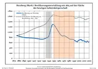 Development of population since 1875 within the current boundaries (Blue line: Population; Dotted line: Comparison to population development of Brandenburg state; Grey background: Time of Nazi rule; Red background: Time of communist rule)