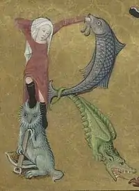 Testard has been influenced here by Netherlandish printmaker Master I. A. M. of Zwolle's Battle of Two Men with a Centaur, to which he introduces Death, a lion and a wild-woman.[8] Interpretation of this scene is problematic. Typically understood to represent a Centaur battling the Lapiths, a purely mythological tale and unusual subject for use in the "Office for the Dead", Belkin posits that this contest between man and beast is "symbolic of the struggle against dark forces. The Centaur and the wild woman form a single unit—the personification of vice in terms of Christian allegory. The private nature of the Book of Hours leads one to infer that Charles used the allegory of the struggle with the Vices for his own political vendetta against his rivals, conveying in this enigmatic miniature his bitter enmity towards those who had wronged him."[9] |