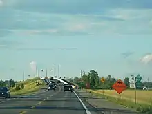 Highway 140 begins at an intersection with Highway 3 on the eastern edge of Port Colborne. From there, Highway 3 continues east to Fort Erie; to the west it becomes Niagara Regional Road 3.[3] The roadway carrying Highway 140 continues south of Highway 3 as a local road named Elizabeth Street, whereas Highway 140 travels north, to the west of forestland and a quarry. The highway parallels the Welland Canal throughout its length, always within 2 kilometres (1.2 mi) of the waterway.[4][5] Wooden high-tension powerlines parallel the highway until it diverges, curving towards the northeast immediately north of Chippawa Road. It travels diagonally for several kilometres before ascending on an overpass and crossing the former Canadian National Humberstone Subdivision tracks.[6]