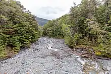 4 ha (9.9 acres) of the river near the Buller is a Scientific Reserve for Black-billed Gulls (tarāpuka) and Black-fronted Terns (tarapiroe).[6] Forest in the valley is dominated by red beech (tawhai raunui), with some silver beech (tahina), several varieties of filmy ferns, including narrow filmy-fern, several coprosmas, including red-currant coprosma, and weeping māpou.[7]